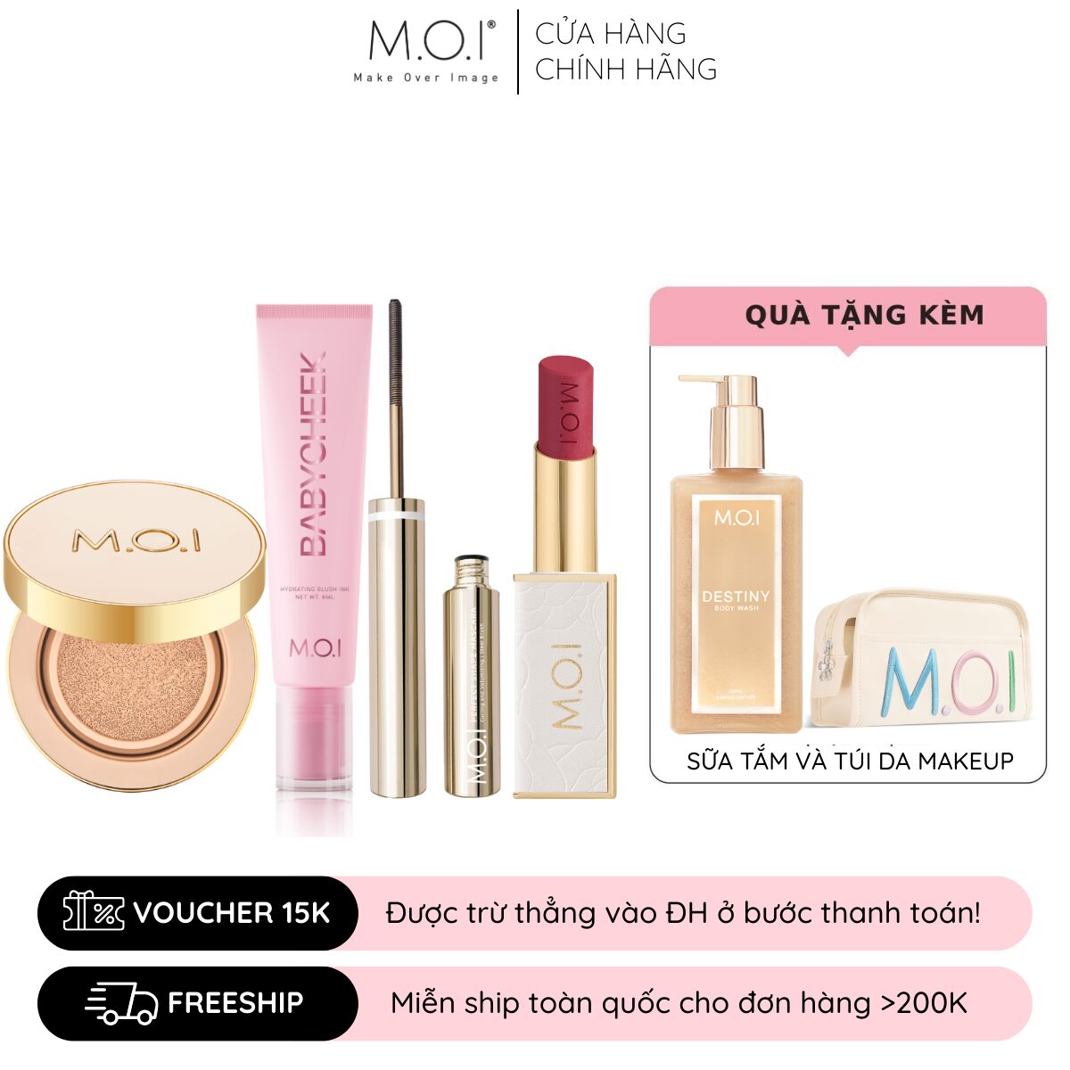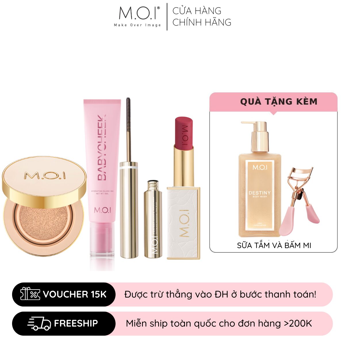 Bộ Trang Điểm Hằng Ngày: Phấn Nước Premium Baby Skin, Má Hồng Sữa, Chuốt Mi Và Son Thỏi Love M.O.I